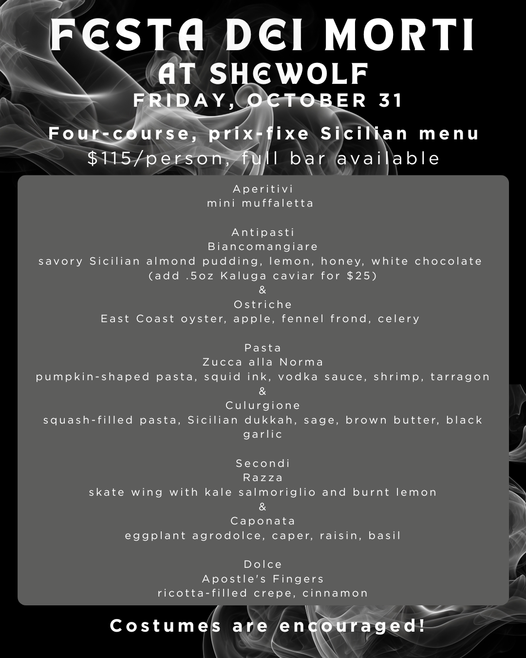 You’re invited to a special celebration of Sicily’s Festival of the Dead, known as “Festa dei Morti.” Join us for an unforgettable evening as we transform our dining room into a hauntingly beautiful Sicilian feast.
